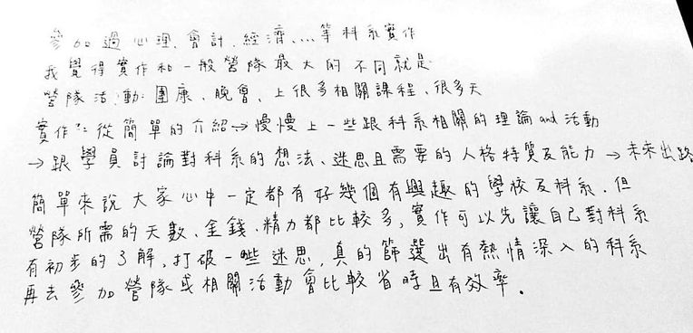 團隊成立至今,已擁有醫學、化工、資工、會計、法律等十餘個橫跨一、二、三組不同學群與科系的實作活動,並已受建中、延平、北一等多所高中老師及輔導室邀請,入校辦理科系實作。